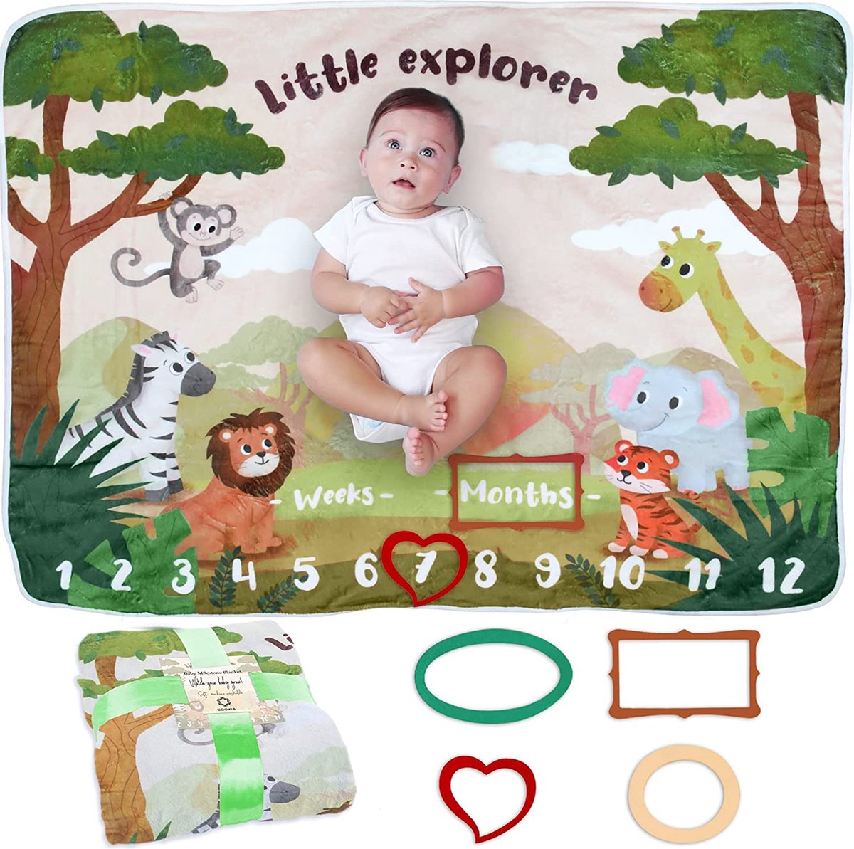 Specificaties: Baby Mijlpaaldeken | Perfect Kraamcadeau | Milestone Deken | Voor Jongen of Meisje, Unisex | Safari en Jungle Thema | Zacht, Dik en Comfortabel | Maandelijkse Fotoherinnering | Inclusief Frames