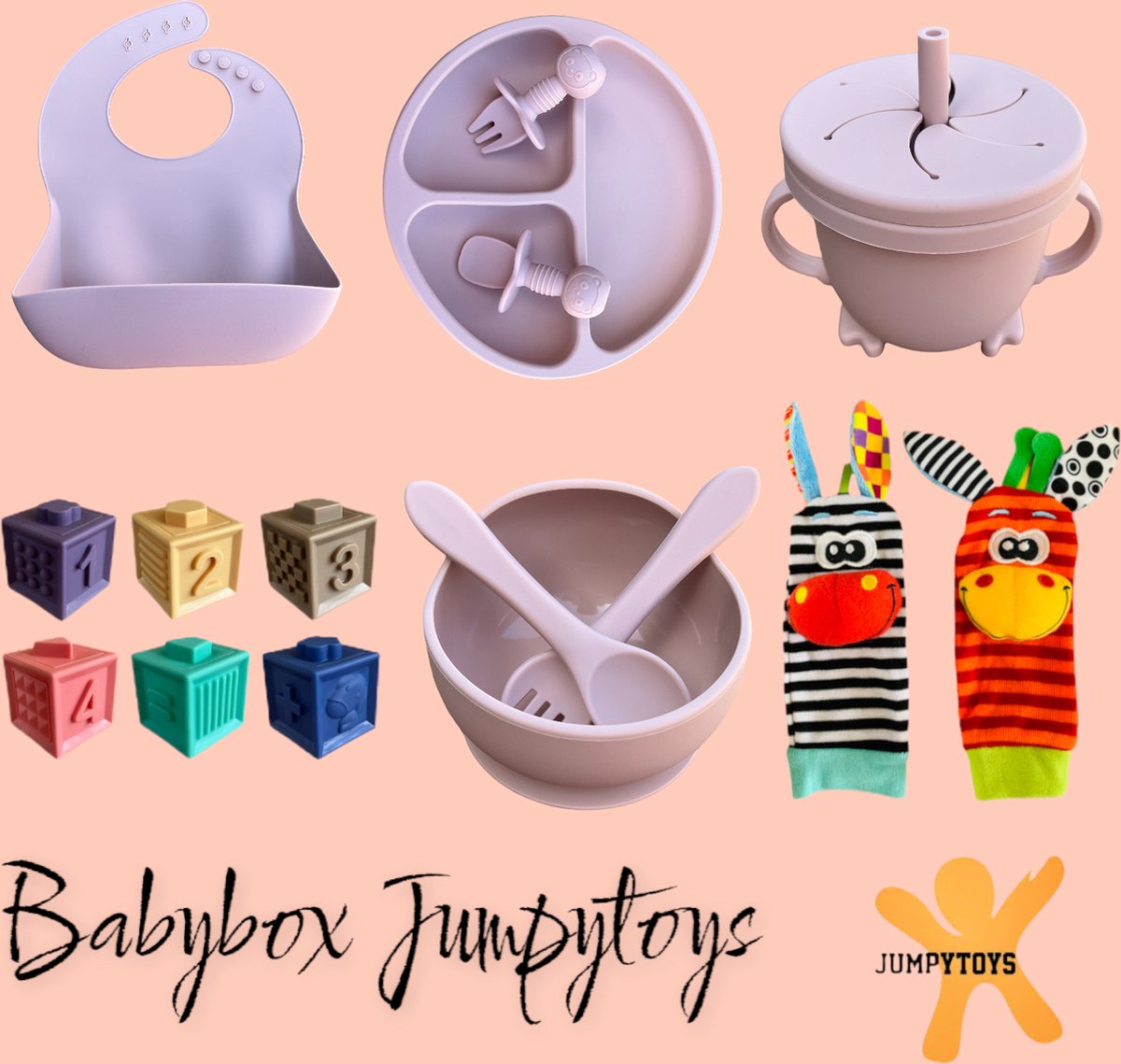 Specificaties: BABYBOX JUMPYTOYS – Babygeschenkset – Kraamcadeau – Kinderservies – Eetservies – Babyblokken – Babysokken met rammelaar – Babybox – PINK