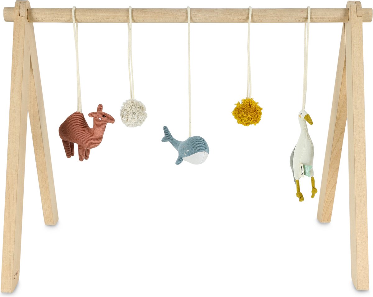 Babygym Kameel – Reiger – Walvis | Trixie Leg je kleintje onder de speelboog van Trixie en ze hebben uren kijkplezier. De babygym bestaat uit het houten gedeelte en uit de drie verschillende diertjes en twee pompoms.