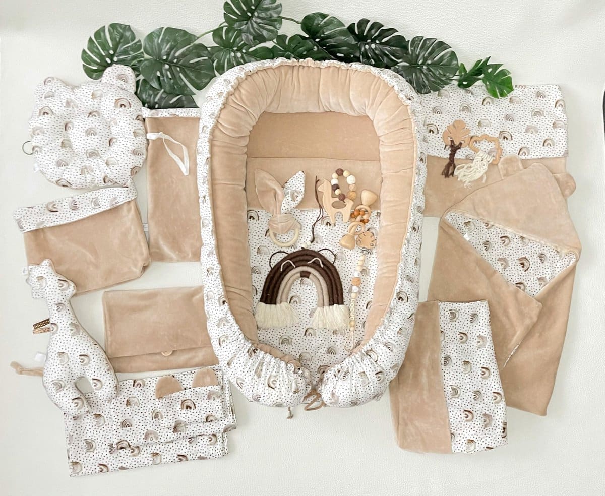 Specificaties: Babyset | babynest set | Beige | Regenboog print | Fluweel | 20-delig | Compleet set | Oeko-tex | +GRATIS DRAAGBARE ELEKTRISCHE BORSTKOLF t.w.v. €89,99