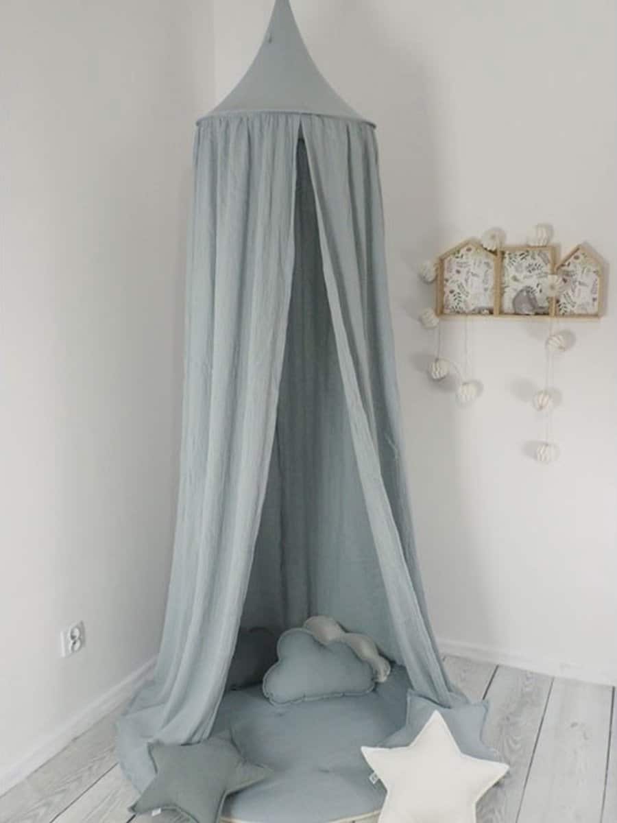 Hangende Speeltent + Vloerkleed + Kussens Grijs Deze set met hangende speeltent, vloerkleed en bijpassende kussens is een prachtige eyecatcher in je baby- of kinderkamer. Hartstikke gezellig, zeker wanneer je de ondergrond aankleedt met dit leuke zachte speelkleed afgewerkt met sierlijke ruches aan de buitenzijde. Zo creëer je een knusse speeltent met een zachte ondergrond. Een speeltent neemt net iets minder ruimte in dan een tipi, maar is net zo knus om in te lezen en spelen.