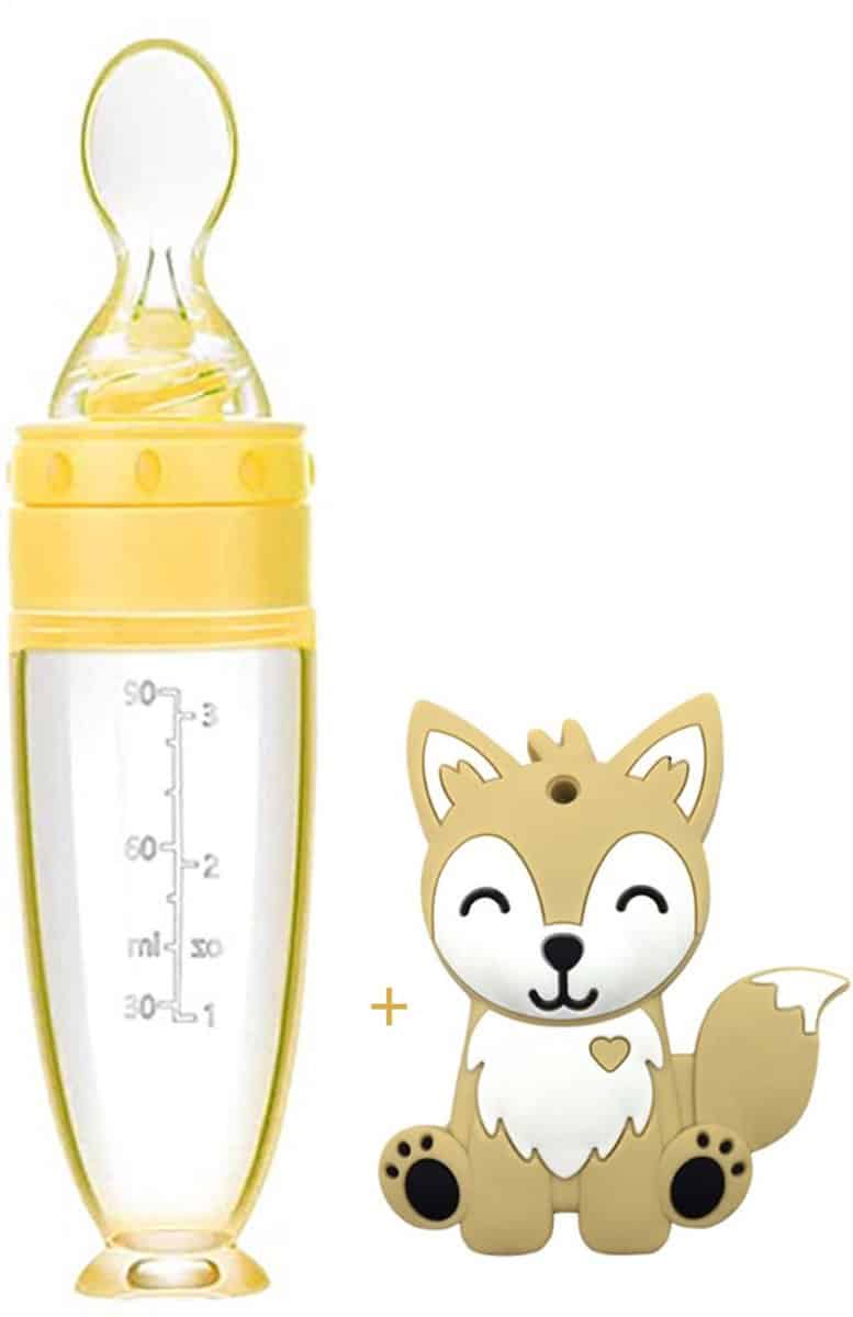 Biberoia® Bijtring en knijpfles met lepel – Baby – Kinderbestek – Baby speelgoed – Kraamcadeau – Babyshower – Geel