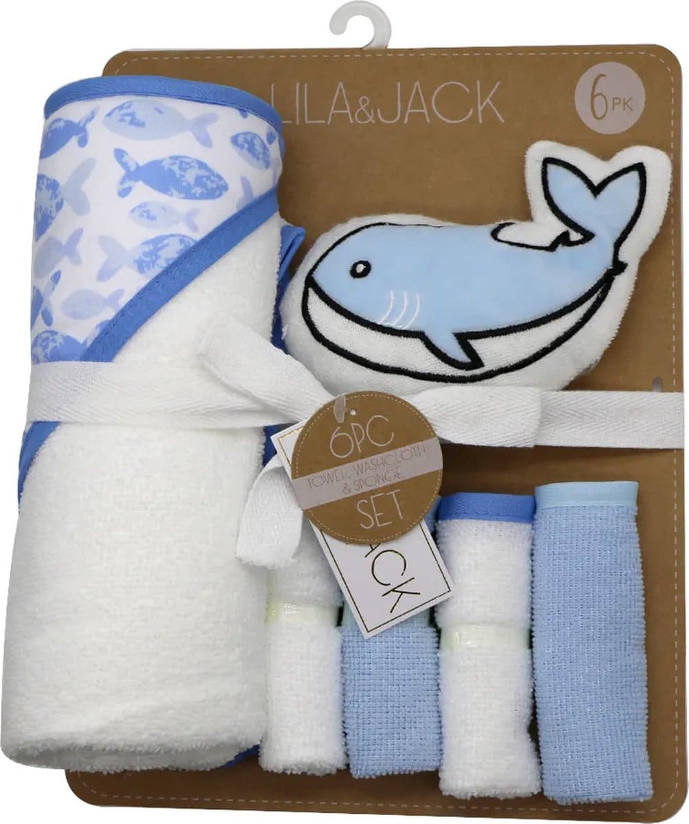 Deze 6-delige baby cadeauset maakt badderen een feestje! Leuk om te geven en uiteraard leuk om te krijgen. Deze badset bestaat uit een warme, zachte badcape, 4 handige gezichtsdoekjes en een haai spons.