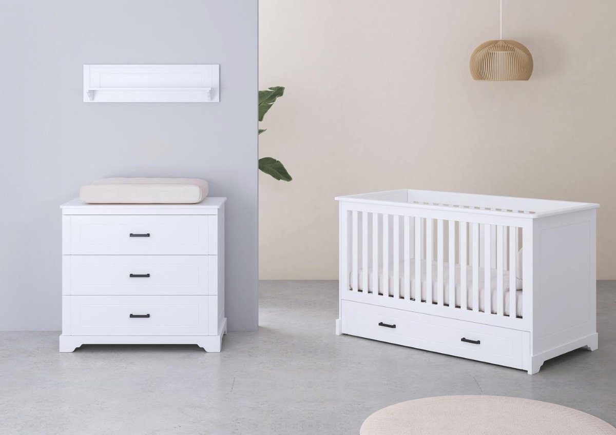 Babykamer Malibu van Cabino is een moderne en stijlvolle babykamer. Deze babykamer bestaat uit een ledikant en commode. De witte meubels geven de babykamer een frisse uitstraling. De stevige meubels staan goed in elk interieur. Vanwege het gebruik van verschillende materialen is er een nuance verschil in de kleur wit (bijvoorbeeld de spijlen van het bed tonen net wat anders wit dan de bedromranding).