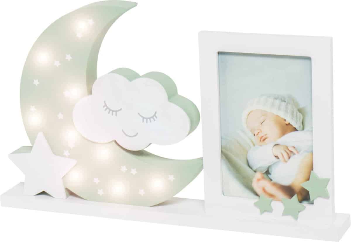 Een foto maken gaat tegenwoordig makkelijk en snel, iedereen heeft wel een smartphone met camera. De technologie zorgt er ook voor dat de kwaliteit van de foto’s steeds beter wordt. Moonlight frame fotolijst is speciaal ontworpen om uw dierbaarste foto’s meer aandacht te geven. Deze fotolijst bestaat uit een maan, een lief wolkje met een gezichtje en een sterretje. In de fotolijst passen foto’s van 10 x 15 cm. Het bijzondere aan deze fotolijst is dat de maan 9 kleine LED-lampjes bevat, zodat de sterren echt rondom je kindje schijnen. Zo heb je met deze Moonlight frame fotolijst een soort lamp die een sprookjesachtig licht verspreidt in de babykamer of woonkamer.