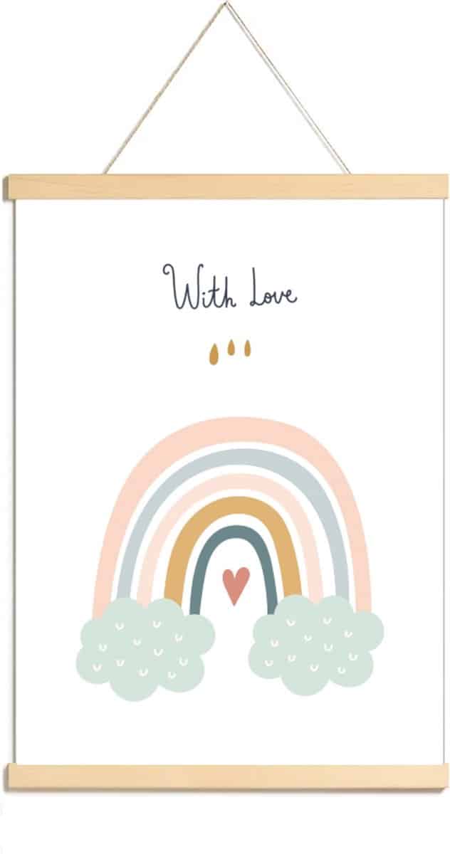 Je krijgt een super leuk en kant-en-klaar decoratiestuk (A3 formaat) voor in de babykamer of kinderkamer. Een mooie Regenboog with Love canvas poster in een elegante houten frame (met touw), zodat je de poster direct kunt ophangen. Je kunt dus zelf bepalen waar de poster opgehangen wordt, je hebt maar 1 schroefje nodig!