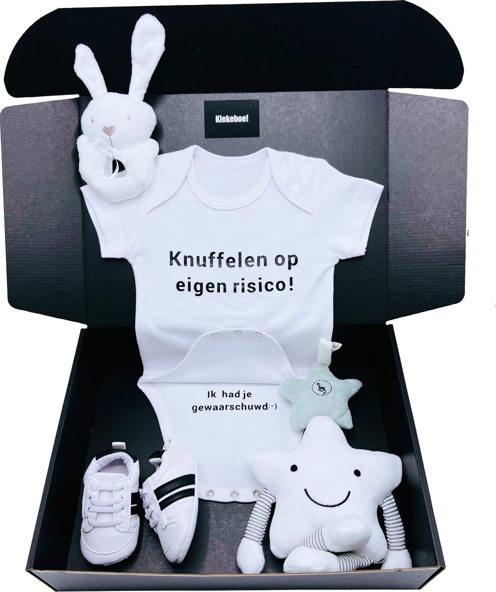 Een prachtige zwarte geschenkdoos met daarin een 100% biologische witte romper, babysneakers, een muziekmobiel en een pluche rammelaar.