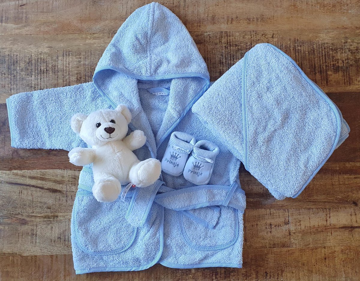 Een blauwe badjas maat 0-6 maanden, extra grote blauwe badcape, kleine witte teddybeer en schattige blauwe prinsje slofjes.
