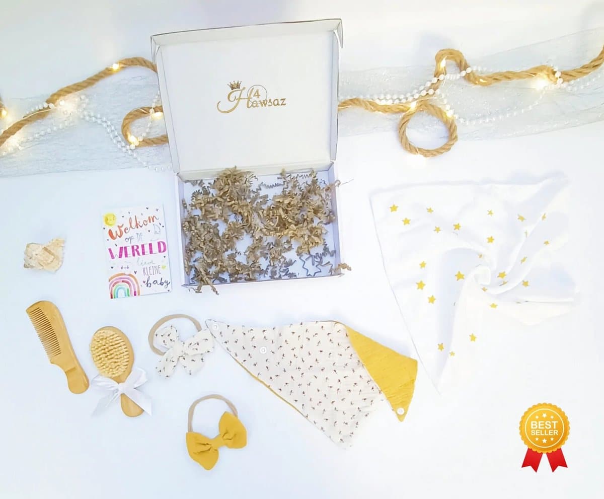 Kraamcadeaus -Babygeschenkset – Babybox – Borstel set met naam – Babyverzorging – Slabbetje – Geboortekaartje – Geboortecadeau – Haarbandjes met strikje 2 x – Graveren met naam – Gepersonaliseerd – Baby cadeau met naam – Hawsaz.nl Cadeau- Babyshower