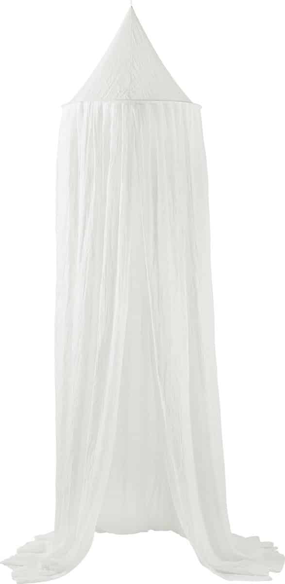 De klamboe is gemaakt van 20% katoen en 80% polyester en werkt ook nog eens tegen de vervelende muggen. Je hangt de klamboe eenvoudig op met een haakje in het plafond.