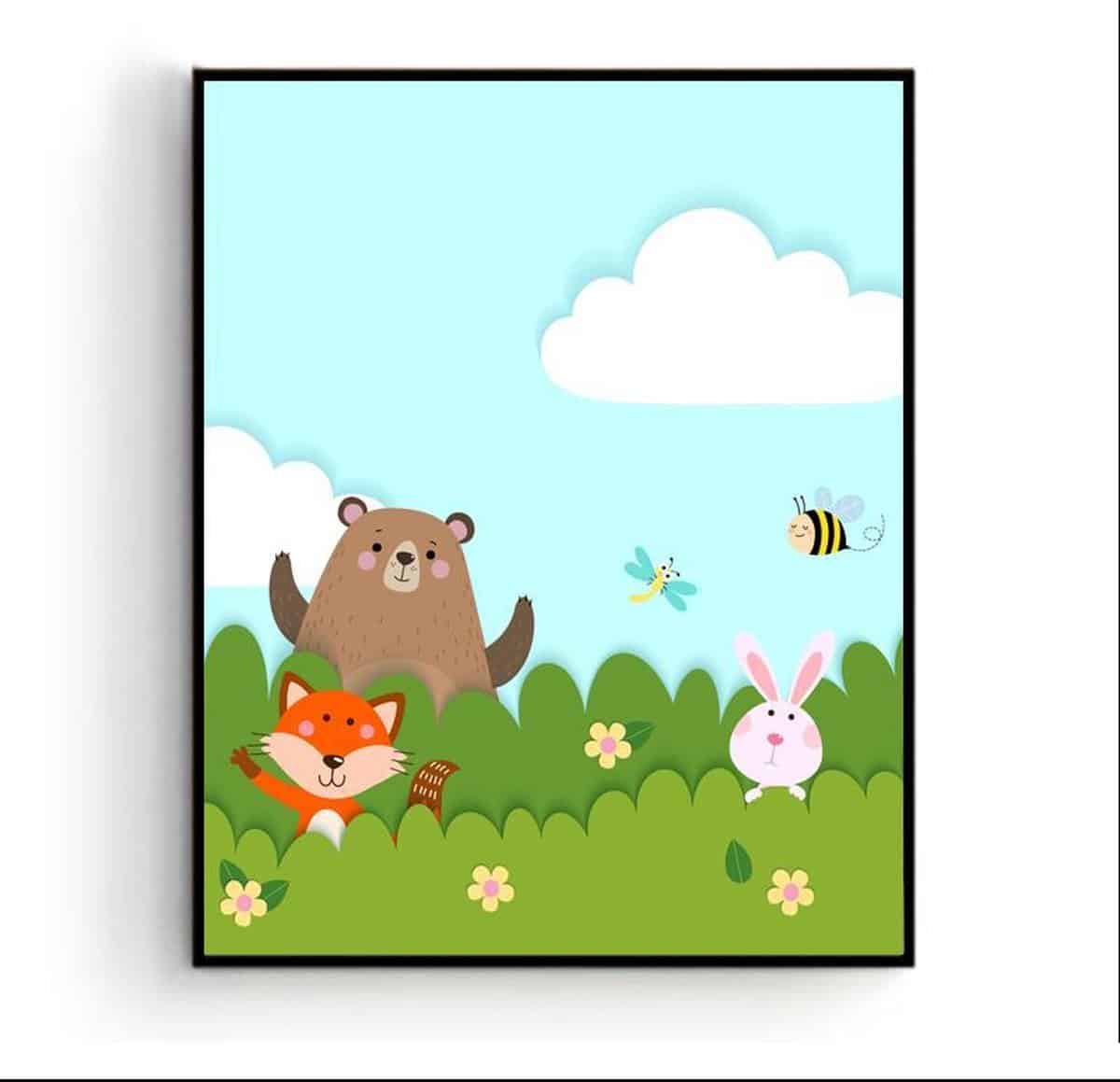 Met deze poster van dieren in de bosjes, beer vosjes konijntje en een bijtje en libelle geeft u aan iedere kamer in een handomdraaien een nieuwe look.