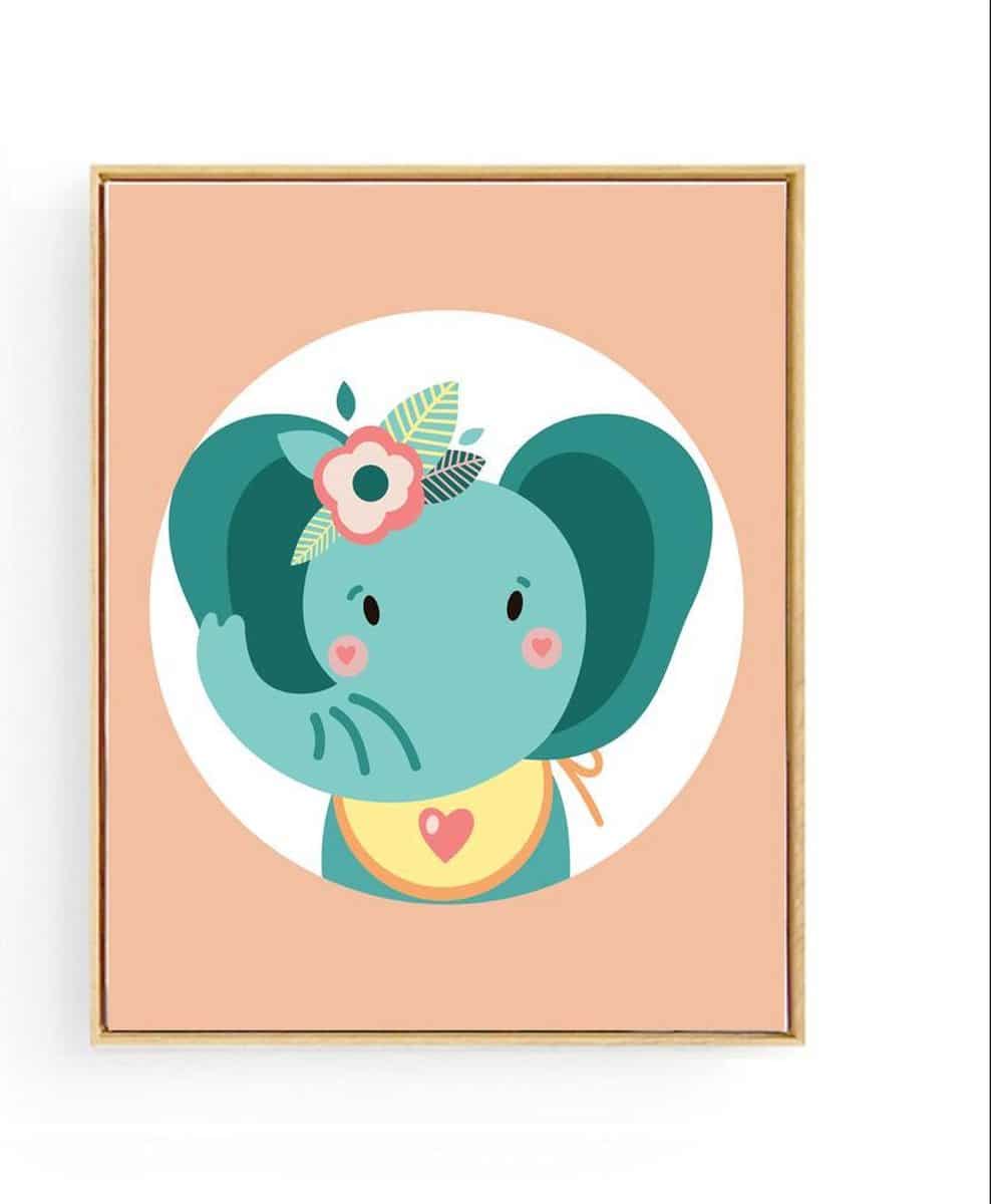 Poster Olifant Oranje met Bloemetje – 40x30cm / A3 – Dieren – Baby / Kinderkamer Muurdecoratie