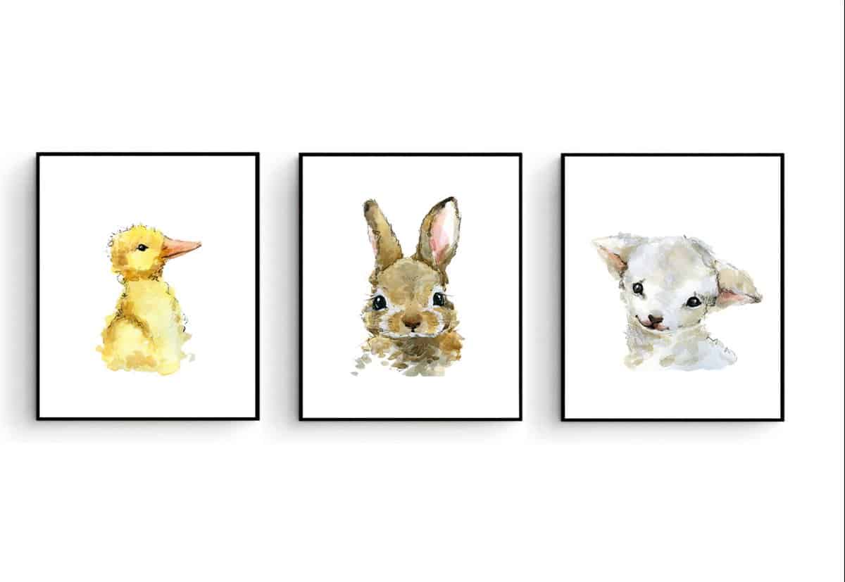 Met deze posters van de aquarel getekende dieren eendje konijntje en lammetje/schaap geeft u aan iedere kamer in een handomdraaien een nieuwe look.