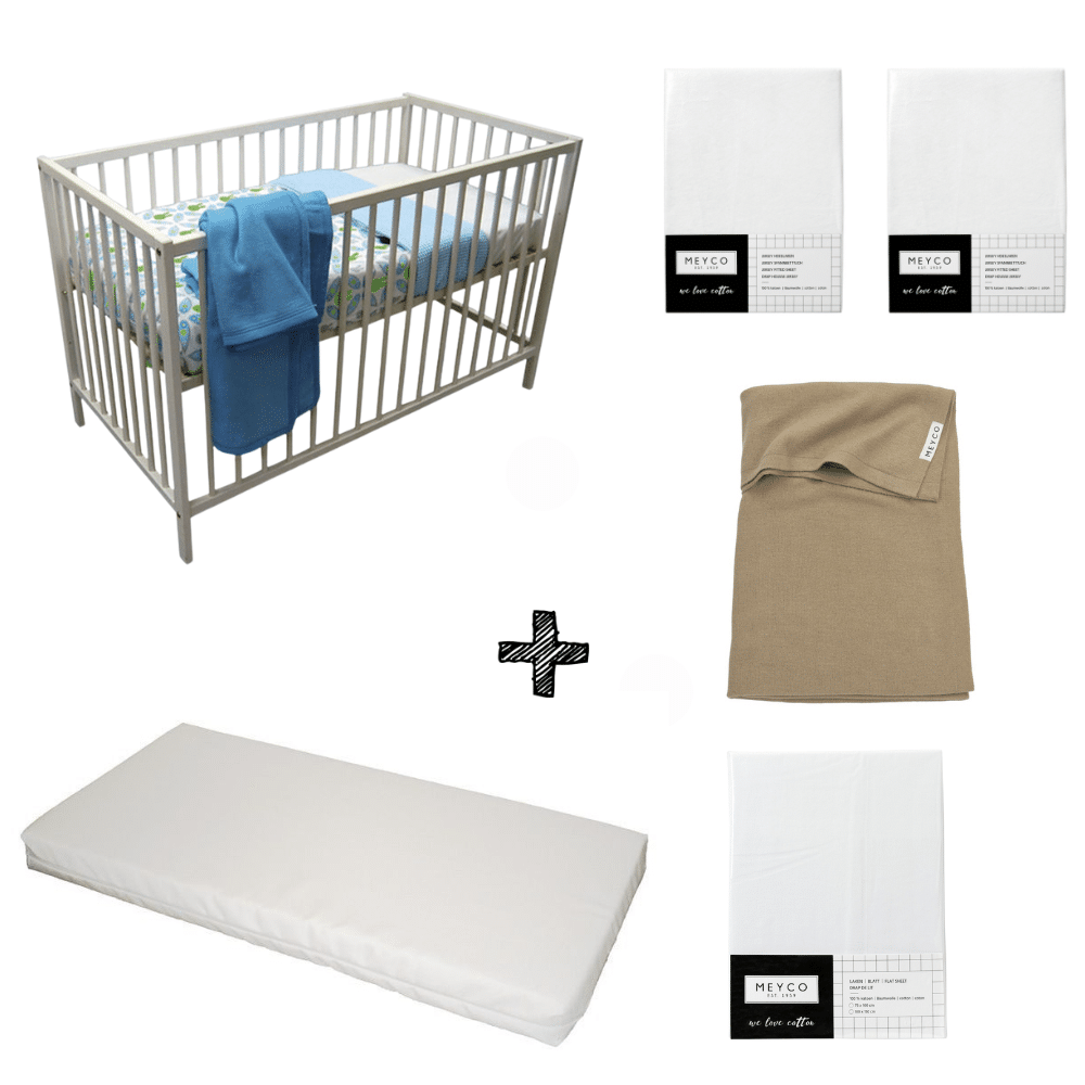 Set | Ledikant Open Basic White + Matras Simply Go + Hoeslaken Meyco Wit (2st) + Laken Meyco Wit + Deken Meyco Basic Taupe