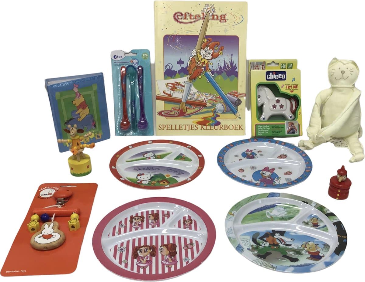 Specificaties: spelletjes/kleurboek Efteling bordjes/baby rammelaar/fotoalbum/kinderwagenhanger/tandendoosje/lepels/drukdier/muziekdoos poes/ Uitdeelcadeaus schoencadeaus