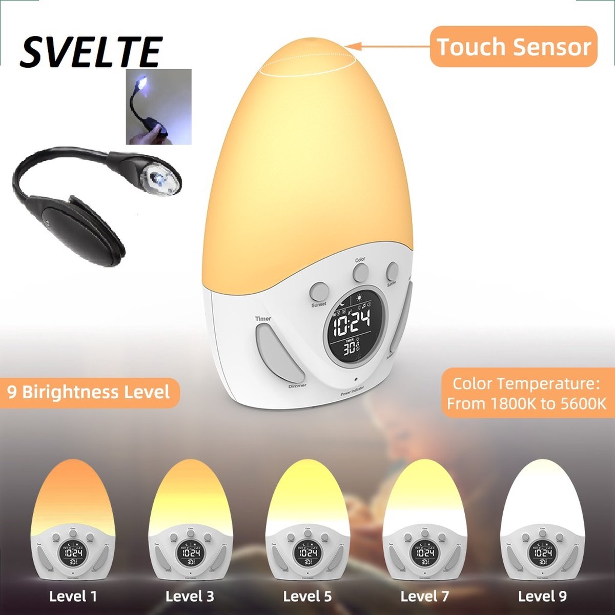 SVELTE- Alarmklok – Slaaptrainer – Zonsopgang en zonsondergang simulatie – Touch sensor nachtlamp – Natuurgeluiden – Inclusief Gratis Leeslampje
