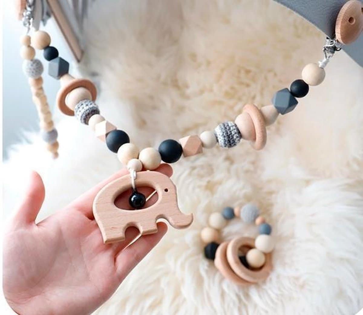 Deze mooie stijlvolle wagenspanner is een prachtig baby cadeau om je kinderwagen eens flink op te vrolijken. Of natuurlijk een prachtig baby cadeau om te geven. Met mooie subtiele kleuren en structuren zal er genoeg moois te zien zijn voor je baby. Deze wagenspanner is gemaakt met onbehandelde beuken kralen, enkele siliconen kralen en afgewerkt met gehaakte kralen. Kwaliteit, stijlvol en veilig voor de kleintjes. Natuurlijk verpakken wij de set feestelijk en zal deze set zeker in de smaak vallen.