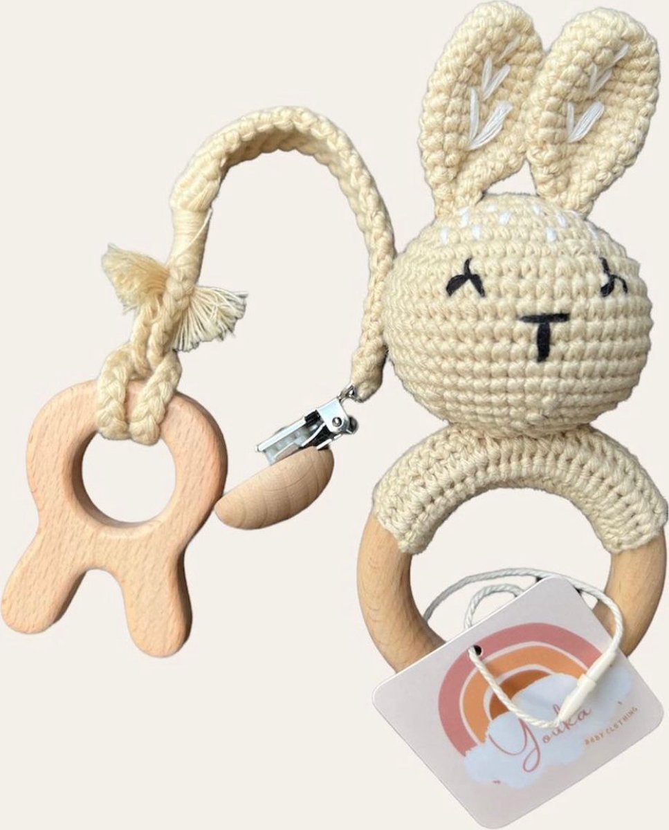 Specificaties: Youka – Rammelaar Nourayn – Bijpassende speenkoord – Baby – Cadeau – Beige